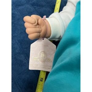 The Lee Middleton First Born Romper Series Boy Baby Doll from 1996 is a limited edition collectible featuring a 19-inch vinyl doll with a soft body. This baby doll, part of the Boys Series by Lee Middleton, has blonde straight hair, closed eyes, and a light complexion. Signed by the artist, this original doll is perfect for all occasions and is a vintage piece from the 1990s, making it a valuable addition to any doll collection.