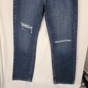 High rise straight leg in a classic dark wash with light factory distressing. Structured vintage-inspired denim with flattering 12” rise and classic button/zip closure.