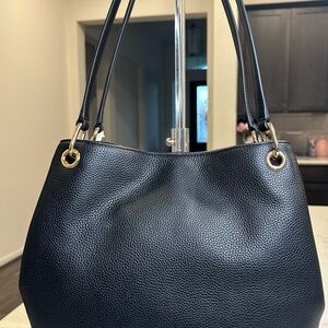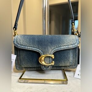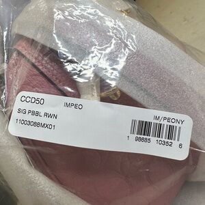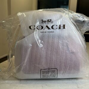 Chic pink leather satchel with embossed design. Features gold-tone hardware and signature Coach tag.