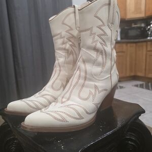 Stylish cream heeled boots with Western stitching. Perfect for adding flair to any outfit.