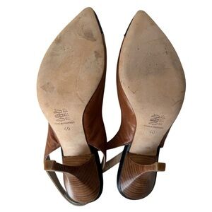 Made in a family run factory in Portugal. A pointy-toe slingback heel with a colourblock pattern, featuring a combination of brown and black leather.