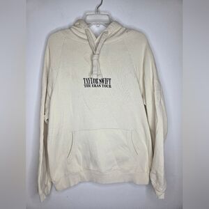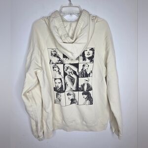 High-quality beige cotton blend fabric. Ideal for various projects. Beige hoodie with front pocket featuring "Taylor Swift | The Eras Tour" printed on wearer's front chest and photos of Taylor Swift printed on back. Oversized fit.