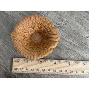 Facial mask application set includes a dark amber glass jar with a black screw-top lid, a decorative terracotta mixing bowl, a small wooden spoon, and a synthetic fan brush. The terracotta bowl features intricate embossed floral and geometric patterns, while the fan brush is designed with a clear acrylic handle and vibrant orange bristles for smooth product distribution. The wooden spoon offers a natural touch for scooping and mixing ingredients.