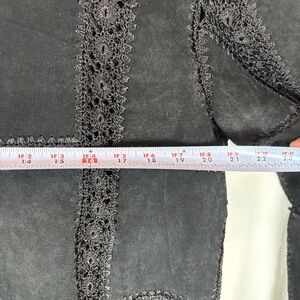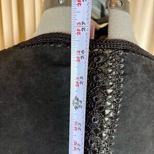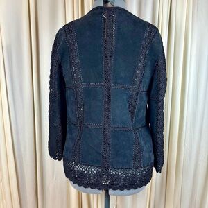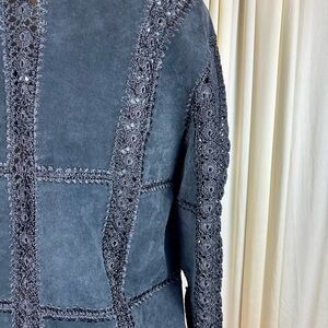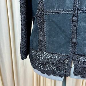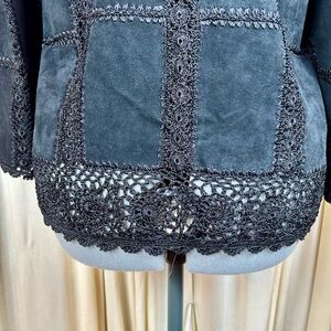 This elegant black suede and crocheted boho cardigan jacket features intricate crochet trim, perfect for adding a touch of sophistication to any outfit. Ideal for both casual and formal occasions. No tags. Pristine condition!