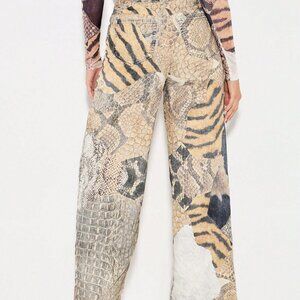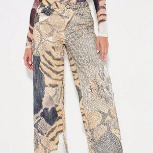 Multicolor Women's Mixed Animal Print Patchwork Wide Leg High Rise Jeans