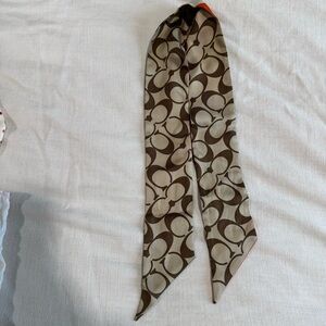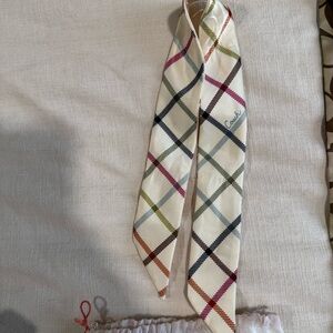 Set of 2 Coach Silk Twilly Scarves. Y2K Vintage Coach. Small silk scarf with Multi Color Plaid & Polka Dot Pattern and script Coach logo. Large Silk scarf with multi color strip pattern and brown & tan Coach C logo print. Cute tied on bags or in hair. Both in good condition! Come with original coach dust bag.