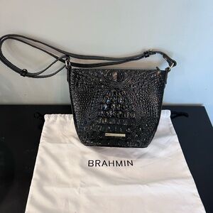 Elegant Brahmin shoulder bag with embossed floral pattern and matching billfold. Features cream and blue tones. Ideal for any occasion. Package includes the handbag and the billfold together. Only used a few times, like new.
