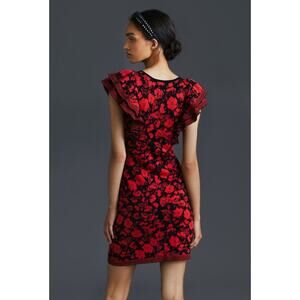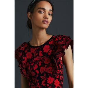 Brand new from Anthropologie! The Eva Franco Ruffled Mini Sweater Dress features a bold floral knit pattern in rich red and black hues with fluttery ruffle sleeves and a fitted silhouette. Elegant yet cozy — perfect for fall, winter, or holiday events.