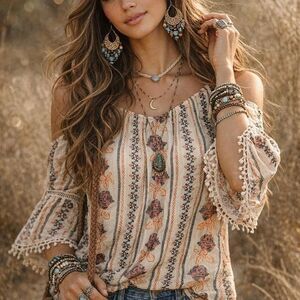 boho, hippie, cottagecore, peasant blouse, folk style, festival top, romantic, vintage-inspired, free people vibe, coachella, gypsy, earthy, soft girl, western boho