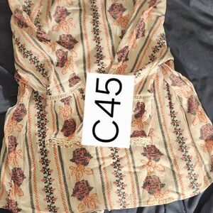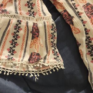 Features a soft cream base with woven floral/folk stripe pattern, flowy silhouette, and statement bell sleeves finished with delicate lace trim. Lightweight and breathable—perfect for layering or wearing solo. Gives effortless hippie, cottagecore, and festival vibes.