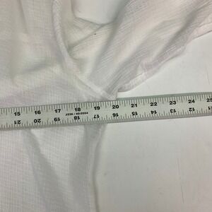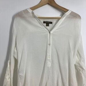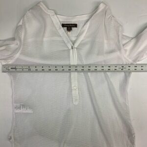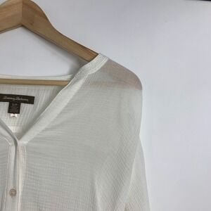 Keywords: Tommy Bahama, gauze, linen blend, roll tab sleeves, V neck, tunic, white top, lightweight, casual, resort wear, beachwear, button up, sample item