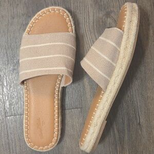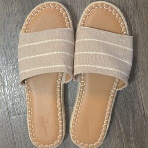 Step into comfort with these chic tan slide sandals. Perfect for any casual outing.