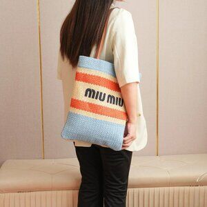 MIU MIU LIght Blue Beige Orange Raffia-Effect Embroidery Vertical Woven Tote Bag