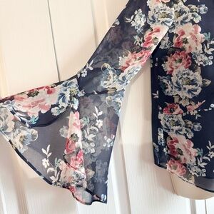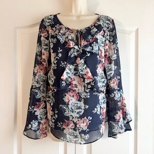 Excellent condition no flaws. Details: Ruffle tie neck, floral print, long ruffle flared sleeves, chiffon knit, semi sheer, breathable, lightweight, lined. Material: polyester. Laying flat: pit 19.5 inches; length 24 inches; pit to cuff 19 inches; shoulder 15.5 inches.
