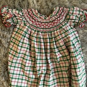Beautiful red and green smocked romper. Two slight stains I haven’t tried to get out as pictured