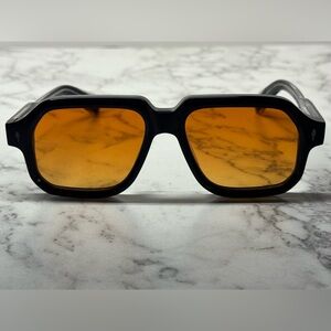 Stylish black sunglasses featuring bold orange lenses. Perfect for a trendy look.