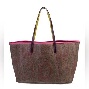 Etro Brown Paisley Multicolored Neon Leather Trimmed Tote Bag
