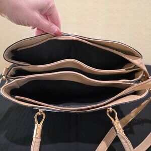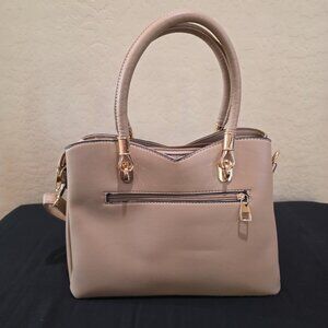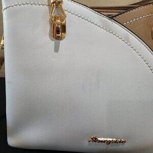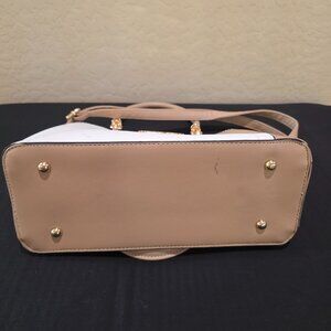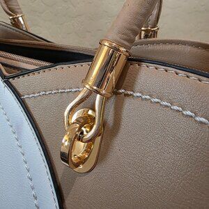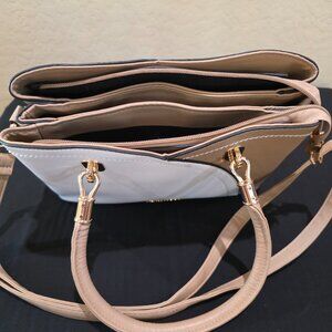 Great white and taupe beige handbag purse with two handles and a removable strap.