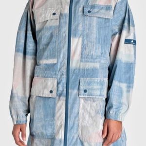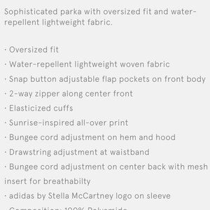 This super sophisticated oversized running parka is sold out everywhere but you can be the lucky one who found it here! It’s super lightweight and water repellent with snap and zip front 2 way zipper. Bungee cord adjustment at waistband and center back. Stella McCartney logo on sleeve. Brand spanking new with tags size medium.