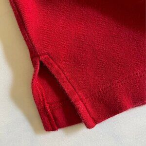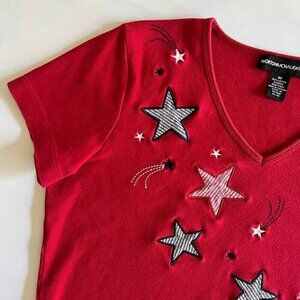 -Details: embroidered stars, 3" slits on both side of shirt, v-neck