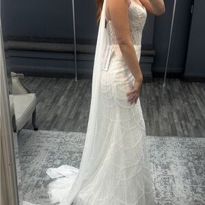 Stunning white wedding dress with intricate beadwork. Features a fitted silhouette and elegant straps.