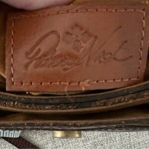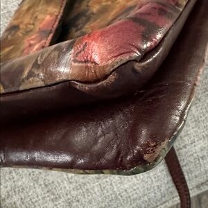 This stylish floral leather crossbody bag is a perfect accessory for any outfit. Its vibrant design and adjustable strap offer both elegance and practicality. Inside is very clean. Snap closure. Lots of storage areas. Zip pocket in back. Appx. 8" x 8" Small white mark on front corner. Bottom corners are a little scratched. Adjustable strap. Great bag! Just don't use anymore.