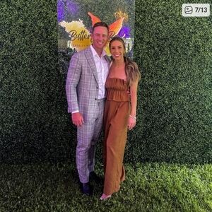 ASTR the Label ruffle top jumpsuit. This is one of the best pieces I've ever worn due to it's linen, cotton fabric. It's just heavy enough that it feels expensive, but not so heavy that you are hot. The elastic back waist offers a custom fit, and the ruffle adjustable top gives you volume and lets you adjust to however tight or lose you need it. Beautiful strapless ruffle neckline, side pockets and wide leg silhouette, which is stunning. The rust brown color is super trendy right now any goes with any skin tone.