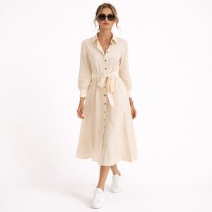 Banana Republic shirt dress, Banana Republic midi dress, cream shirt dress, ivory midi dress, button front dress, tie waist dress, self tie belt dress, long sleeve midi dress, classic collar dress, neutral capsule wardrobe, elevated casual dress, quiet luxury style, minimalist chic dress, travel outfit dress, airline travel look, spring midi dress, summer neutral dress, work to weekend dress, business casual dress, polished everyday dress, A line midi dress, lightweight cotton blend dress, versatile wardrobe staple, modern classic dress, timeless neutral dress, women’s size [insert size], NWT Banana Republic dress