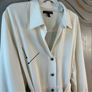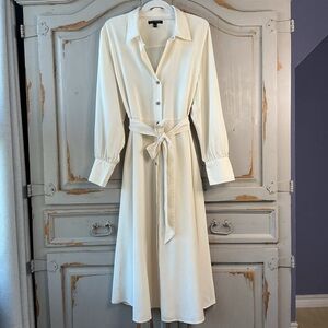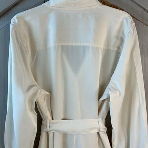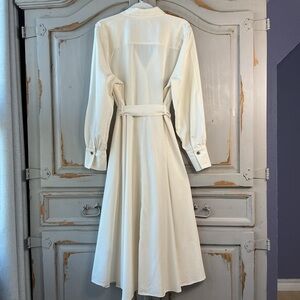 Banana Republic point collar shirt dress in alabaster. Midi length, deep v-neck, long blouson sleeves with buttoned cuffs, and a full button-down front placket. Includes a matching self-tie belt at the waist. 100% Lyocel tencel makes it ultra soft and flowy. Two pinpoint black marks to right front chest, see last photo. Otherwise in excellent condition with no other callouts