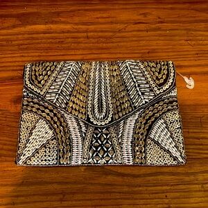 Lulu Mixed Metal Beaded Envelope Clutch silver Brass Seed Bead Black NWOT