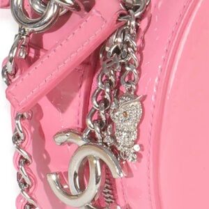 Chanel patent leather pink mini bag. Features a beautiful owl charm and beautiful chain shoulder strap. Includes dust bag.