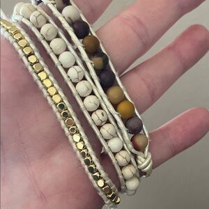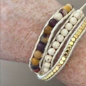 Elegant wrap bracelet with gold, cream, and brown beads. Perfect for any occasion.