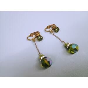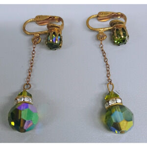Vintage Earrings Gold Tone Clip Ons Aurora Borealis Dangle Rhinestone