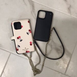Go hands free! This Kate Spade iPhone 13 Pro Max Magnetic Wrap Folio Case on a Chain can be worn over the shoulder or crossbody style. Almost brand new. Includes pristine case. Only worn 2-3 times. Cute cherries print.