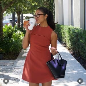 Chic rust mini dress. Sleeveless design. Perfect for casual outings.