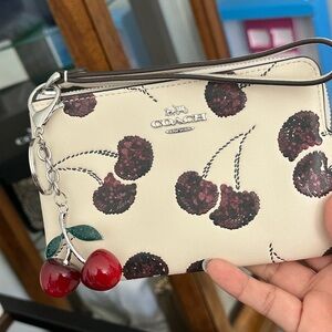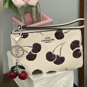 Coach Corner Zip Wristlet Wallet with Cherry Print and Cherry Charm