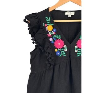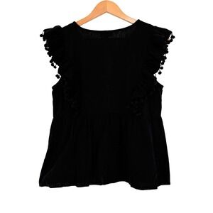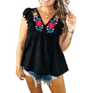 Umgee Boho Embroidered V-Neck Top Pom Pom Trim Ruffle Babydoll Black Size Large