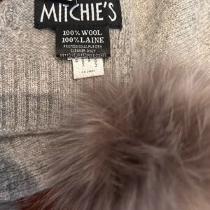 This elegant gray scarf is a versatile accessory for any wardrobe. Its soft texture and classic design make it perfect for any occasion.This item is a Mitchie's (also known as Mitchies Matchings) crystal-embellished knit scarf with real fox fur pom-poms and 100% wool. NWT Retails for $250 and out of stock online. Rhinestones/bling/minimalist