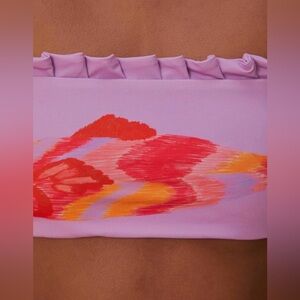 Stunning bikini stop with image of painted fish in red, orange and pink. Can be worn with straps or strapless. Tie back. Ruffle detail. Size XS. About 11 inch panel in front. Front panel 4.5 inches long. Brand new with tags.