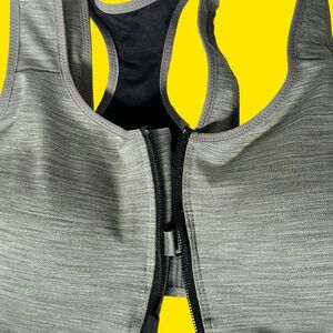 Stylish zip-front sports bra. Heather gray with black accents. Perfect for active wear.