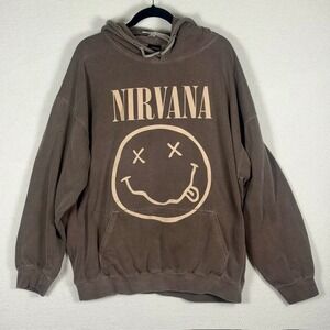 Nirvana graphic hoodie features the iconic smiley face logo and band name in a vintage-inspired screen print. Crafted from a comfortable cotton blend with a soft fleece interior, this pullover includes a classic kangaroo pocket and an adjustable drawstring hood. The garment-dyed brown wash provides a faded, lived-in look perfect for any grunge or rock-inspired wardrobe.