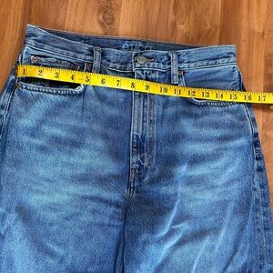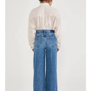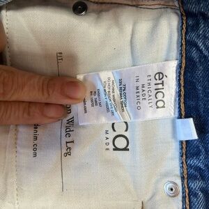 These Etica jeans feature a classic blue hue and a wide-leg flare design, offering a relaxed and fashionable fit. The high-waisted style and intentional knee distressing add a modern touch to your wardrobe.