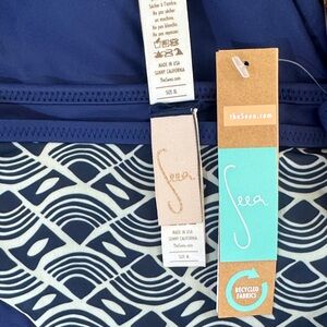 Elegant bikini with navy wave design. High-neck top and matching bottoms.