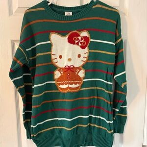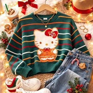 Adorable 🎀 Hello Kitty by Sanrio holiday sweater featuring the cutest gingerbread Hello Kitty graphic on a forest green striped knit. Perfect for Christmas parties, winter outfits, or cozy holiday photos!