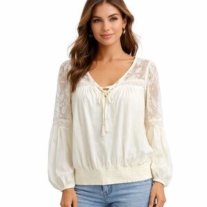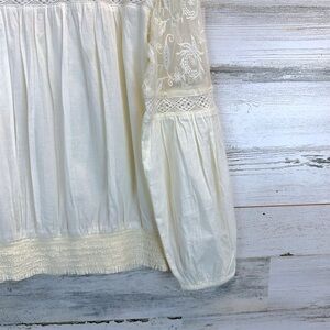 Beautiful Denim & Supply Ralph Lauren ivory peasant blouse featuring delicate lace embroidery, soft cotton body, and romantic boho silhouette.
