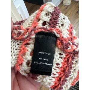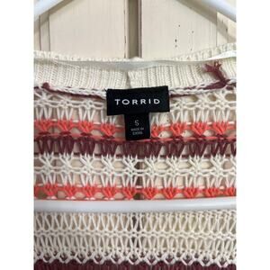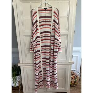 Torrid size 5 long crocheted sister sweater in excellent condition. Cream with salmon and maroon. Measures 31” from armpit to armpit and 53” long.