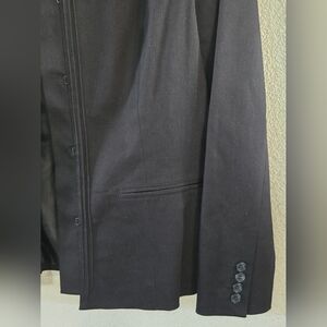 Chic black blazer with a modern design. Features a sleek collar and buttoned cuffs.