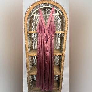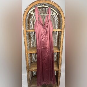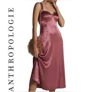 New with tags Anthropologie Cross-Back Satin Midi Dress in a romantic dusty rose / taupe tone.