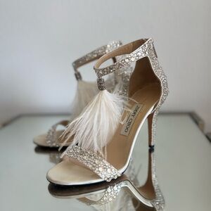 EUC JIMMY CHOO Viola Crystal Embellished feather-trimmed satin sandals $2,295