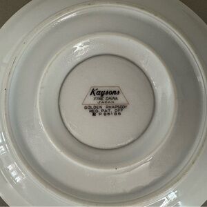 Vintage Kaysons Fine China Gravy Boat with Attached Plate- Discontinued. Small chip shown in photo, last photo shows front view with chip for visibility. Design on both sides of dish.